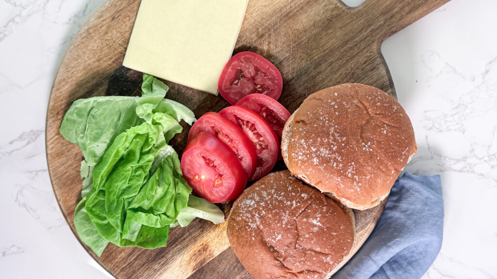 - Prepare your fixing for your burger. I like a multi-grain bun, Monterey Jack cheese, tomatoes and lettuce.