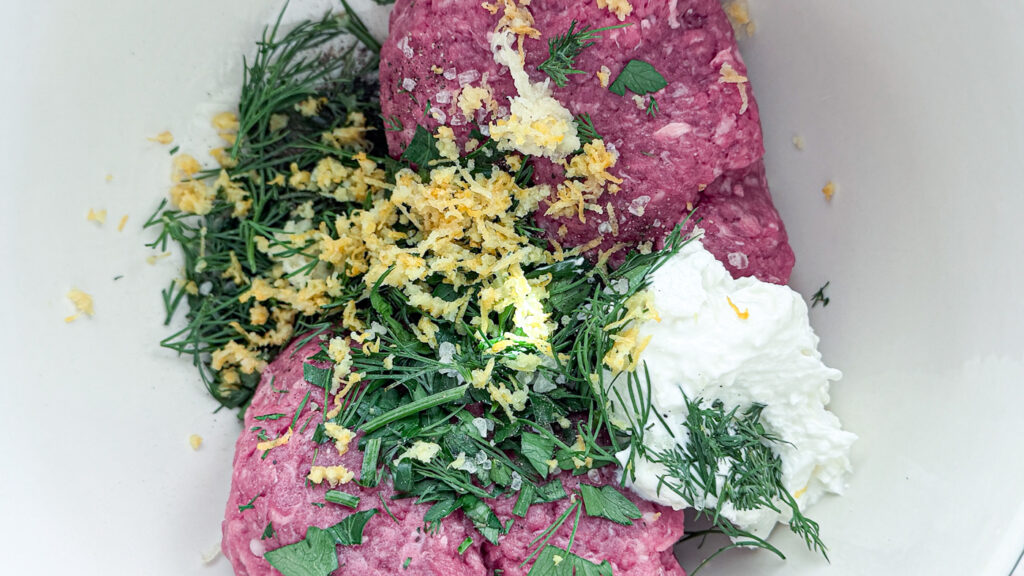 - In a small bowl, mix the beef, zucchini, whipped feta, herbs, garlic, oregano, lemon zest, salt, and pepper.