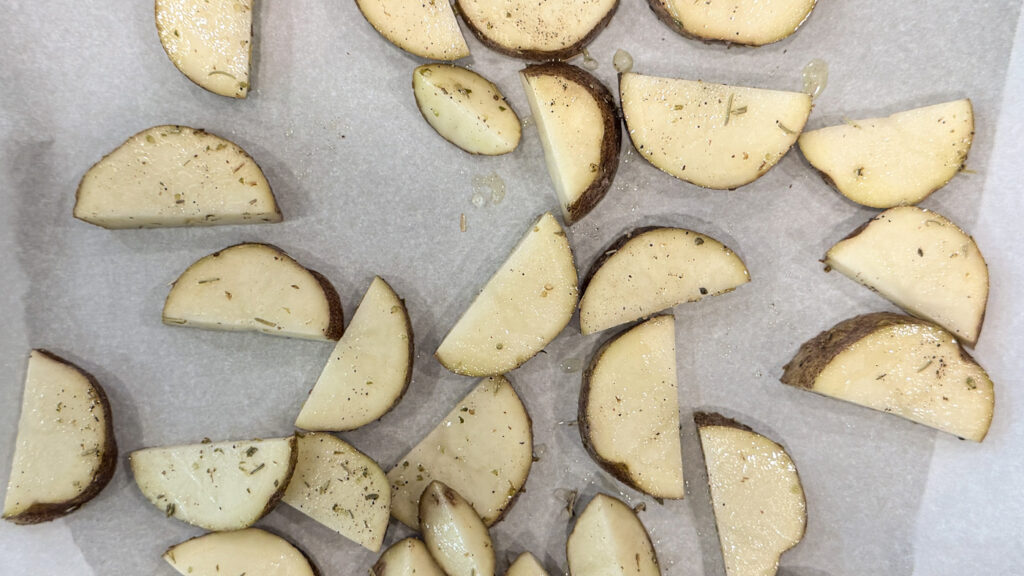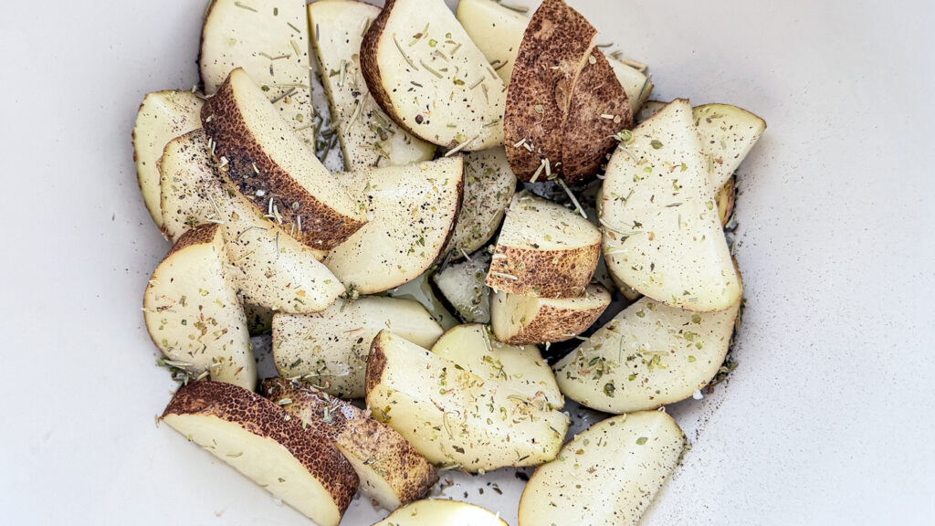 - Cut potato into wedges, place in mixing bowl, and toss with olive oil, oregano, thyme, garlic powder, salt, and pepper.